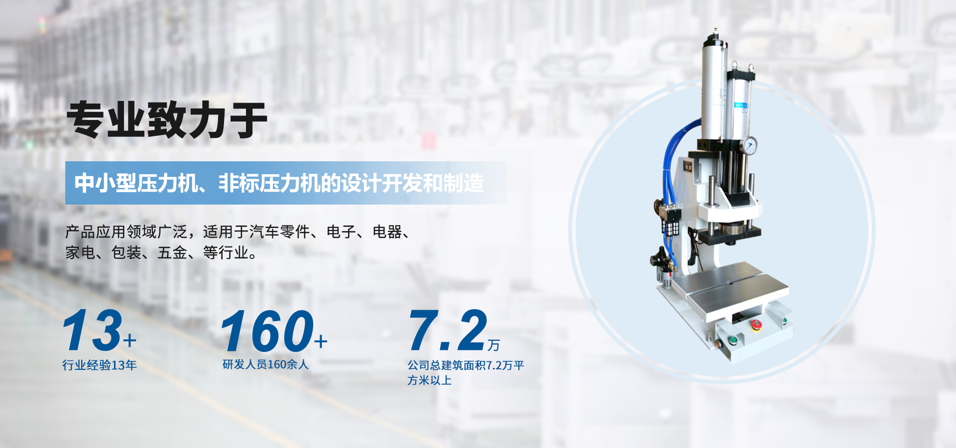 煙臺壟鑫沖壓設備有限公司是集經營、生產、技術開發(fā)為一體的經濟實體,專業致力于中小型壓力機、非標壓力機的設計開發(fā)和制造。在引進德國、日本等國家先進的鉚壓控制技術及機器設計理念的基礎上,結合相關行業的實際需要,開發(fā)出各種臺式、落地式氣動壓力機、手動壓力機、氣液增壓機、氣液增力缸、旋鉚機、無鉚釘鉚接機等鉚接設備。產品應用領域廣泛,適用于汽車零件、電子、電器、家電、包裝、五金、等行業。公司視質量為生命,并一貫遵循對每一臺產品負責,對每一位用戶負責,真誠為您服務。